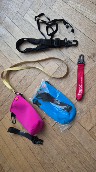 Set composto da tracolle, porta borracce e portachiavi. - Tracolla nera regolabile. - Porta borraccia fucsia. - Porta borraccia blu. - Portachiavi rosso con moschettone.