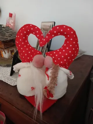 Coppia di gnomi artigianali a tema San Valentino. Perfetti per decorare la casa. - Cappelli a forma di cuore rossi a pois bianchi. - Corpi bianchi con dettagli rossi. - Barba bianca e dettagli in pelliccia. - Misure h. 21, larghezza 20, profondità 15 circa