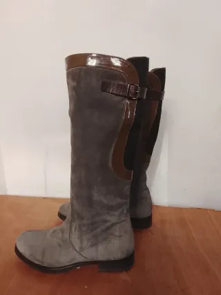 Eleganti stivali alti in pelle scamosciata e dettagli in vernice. - Design con fibbia decorativa. - Inserti elastici per una migliore vestibilità. - Finitura bicolore grigio e marrone.