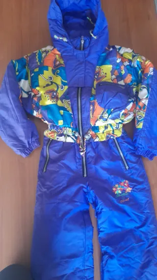 Tuta intera vintage per bambina, perfetta per le giornate sulla neve o per giocare all'aperto. - Colore viola vivace. - Fantasia colorata sul petto e sulle maniche. - Cappuccio integrato. - Zip frontale per una facile vestizione. - Dettaglio ricamato sul pantalone.