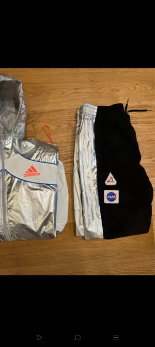 Tuta sportiva Adidas ispirata alla NASA, con dettagli argentati e neri. - Giacca con cappuccio e zip. - Pantaloni con elastico in vita. - Patch NASA e logo Adidas.