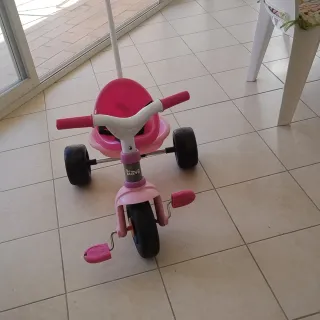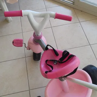 Triciclo rosa per bambina con dettagli in bianco , è stato usato ma ancora super funzionante