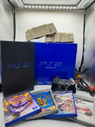 Console PlayStation 2 con scatola originale e diversi giochi inclusi. La console e testata e funzionante, viene fornita con un controller originale e una Memory card, - Giochi inclusi: Spyro Canemedit Godzilla MotoGP. (Il prodotto è testato e funzionante ma a causa del tempo potrebbe presentare imperfezioni e segni di usura, chiedere per maggiori info ed eventuali foto).