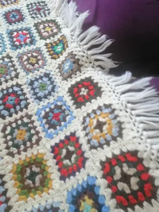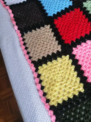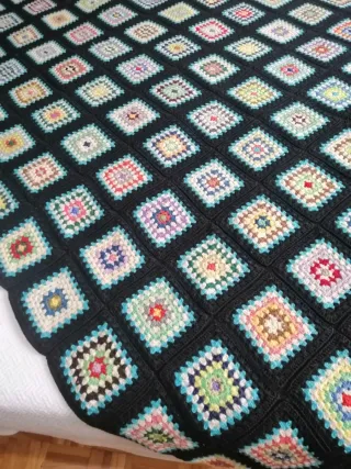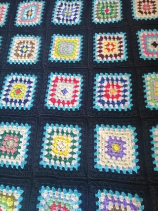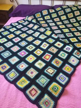 Coperta singola realizzata a mano con cura.in lana, su base nera bellissimi quadri dai colori accesi... Misura cm 115x 225. Nuova. Ottima come scalda- piedi a base letto oppure rallegra l'ambiente su un divano dal colore un po' spento.... - Motivo a granny squares. - Bordi in contrasto.
