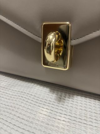 Elegante borsa Furla in una raffinata tonalità beige con dettagli dorati. - Materiale in pelle liscia. - Chiusura a girello dorata. - Design a busta con patta. - Logo inciso sulla chiusura.
