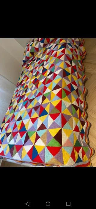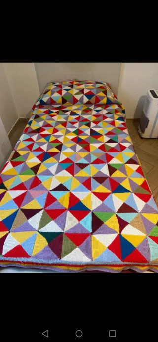 Coperta singola realizzata in lana, perfetta per aggiungere un tocco di colore alla tua stanza. Misura cm 200x250. - Design patchwork con motivi geometrici. Fatta a mano, ai ferri. - Bordi rifiniti con cura.