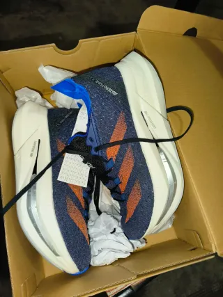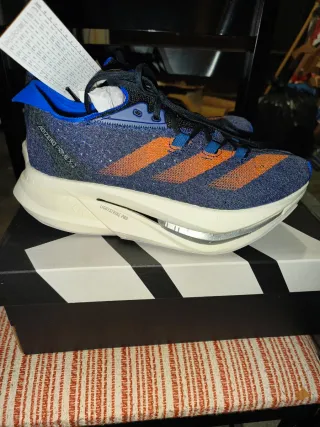 Scarpe da corsa Adidas adizero Prime X 2. - Design moderno con dettagli blu e arancioni. - Tomaia in mesh traspirante. - Suola con tecnologia Lightstrike Pro.