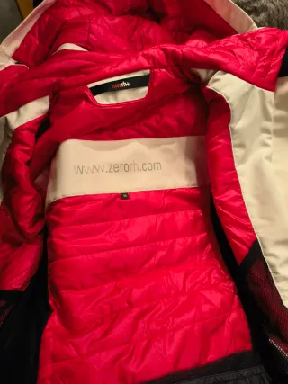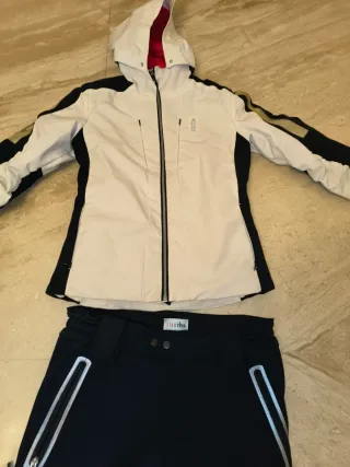 Tuta da sci completa firmata zerorh+. - Giacca bianca con dettagli neri e oro. - Pantaloni neri con zip argentate. - Logo zerorh+ visibile sui pantaloni.