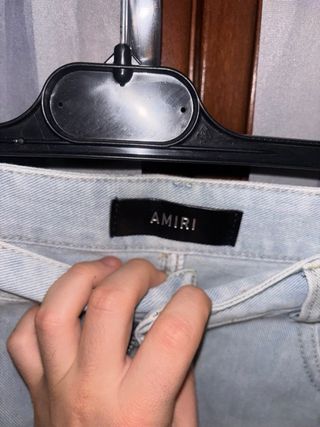 Jeans Amiri da uomo in denim azzurro. Presentano dettagli strappati e decorazioni. - Logo Amiri applicato sulla gamba sinistra. - Dettagli strappati sulle ginocchia e sulla gamba destra. - Decorazioni a strass sul logo.