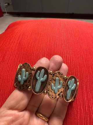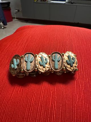 Bracciale elastico con un design ispirato al deserto. Presenta elementi ovali con cactus stilizzati e finitura anticata. - Elementi ovali con cactus. - Finitura in metallo anticato. - Perline dorate tra gli elementi.