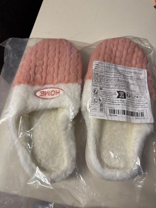 Comode ciabatte con la scritta HOME ricamata. - Parte superiore in maglia rosa. - Rivestimento interno in morbida pelliccia sintetica bianca. - Suola interna imbottita.
