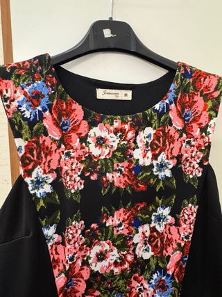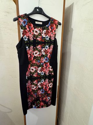 Elegante abito con fantasia floreale e inserti neri. - Fantasia floreale vivace. - Inserti laterali in tinta unita. - Taglio che valorizza la figura. Cerniera laterale