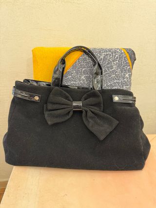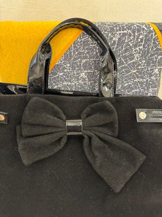 Elegante borsa nera con un grande fiocco decorativo sul davanti. I manici sono in ecopelle lucida. - Fiocco in tessuto. - Dettagli in ecopelle lucida sui manici e sui lati.