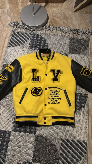Giacca stile varsity con maniche in ecopelle. - Colore principale giallo. - Dettagli ricamati con logo LV e 5522. - Patch a forma di smile. - Scritta ricamata sul lato destro.