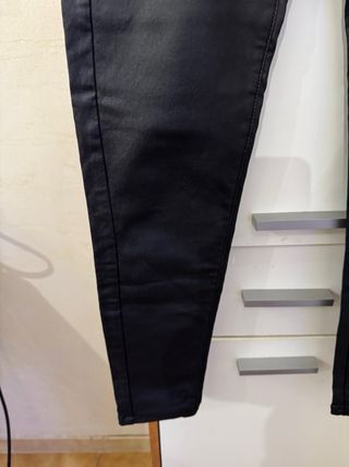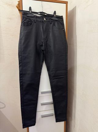 Pantaloni neri con un elegante effetto pelle. - Vestibilità aderente. - Vita alta. - Chiusura con zip e bottone.