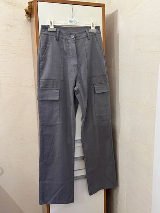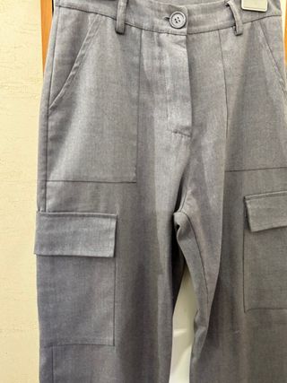 Pantaloni cargo grigi dal taglio moderno. - Tasche laterali applicate. - Chiusura con bottone e zip. - Tessuto resistente.