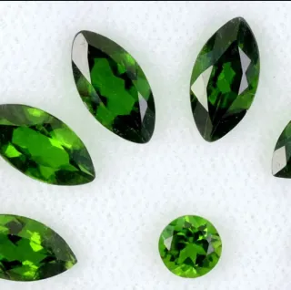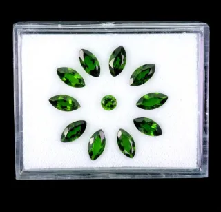 Lotto di 11 gemme taglio marquise e una centrale taglio rotondo. - Colore: verde intenso. - Taglio: marquise e rotondo. - Ideali per creazioni di gioielleria. Gemma Naturale PIETRA: Cromo diopside PESO TOTALE: 6,46 ct (11 pezzi) DIMENSIONI: 3,8 X 3,8 X 2,7 MM. 8,0 X 4,0 X 2,6 MM. PUREZZA/GRADO: If To Vvs TRATTAMENTO: Nessuno ORIGINE: Africa