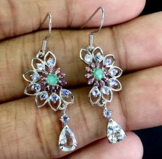 Eleganti orecchini pendenti in argento, con un design floreale arricchito da pietre colorate Naturali. - Metallo: Argento 925 - Pietre centrali verdi smeraldo. - Pendente a goccia trasparente TIPO DI METALLO: Argento Sterling 925 PLACCATO: Oro bianco 14k MISURA (USA) PIETRA PRINCIPALE: Acquamarina ALTRE GEMME: Smeraldo, Granato Rodolite, Tanzanite PESO TOTALE: 3,42 grammi (argento + pietra) DIMENSIONI: * PIETRA DA 1,5 A 7,0 X 5,0 MM. * FACCIA ORECCHINI 41,0 X 13,0 MM. FORMA DELLA PIETRA PRINCIPALE: Taglio a goccia COLORE DELLA PIETRA PRINCIPALE: Blu PUREZZA/GRADO: If To Vvs TRATTAM