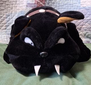 Peluche Bulldog Nero 40 cm Morbido peluche di un bulldog nero, alto circa 40 cm. Perfetto per gli amanti degli animali. - Personaggio: Bulldog Nero - Lunghezza: 40cm - Materiale: peluche morbido - Colore: nero - Dettagli: collare marrone con borchie bianche, occhi chiari e zanne bianche