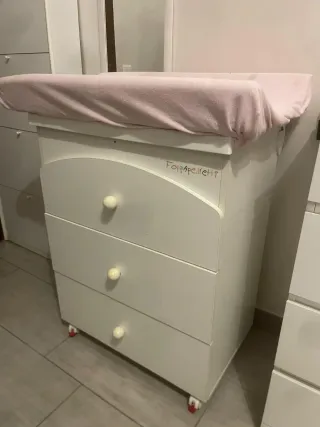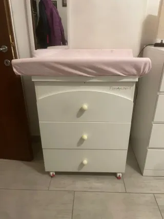 Fasciatoio Foppapedretti in ottime condizioni, quasi come nuovo. - Struttura in legno bianco. - Tre cassetti con pomelli chiari. - Piano fasciatoio imbottito rosa. - Ruote per facilitare lo spostamento.