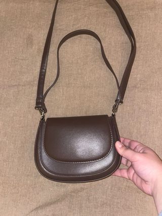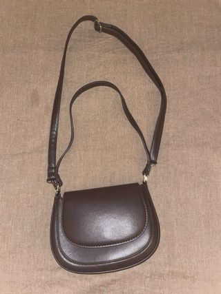 Piccola borsetta Primark in ecopelle marrone, dal design a mezzaluna. Perfetta per portare con te l'essenziale. - Chiusura conpatta. - Tracolla regolabile.