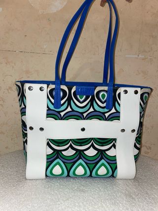 Borsa HOY reversibile con fantasia geometrica. - Manici in pelle blu. - Dettagli bianchi in pelle. - Fodera interna blu.