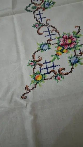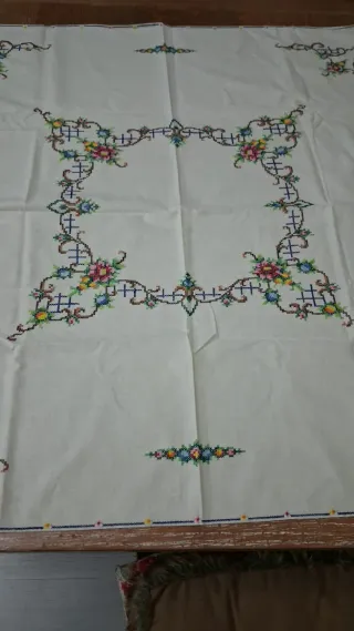 Deliziosa tovaglietta da tè con ricamo floreale a punto croce.Nuova non bagnata.In cotone color panna.Mis 83x83 - Motivo centrale con fiori e dettagli geometrici. - Bordi decorati con piccoli fiori colorati. - Ideale per aggiungere un tocco vintage alla tavola.