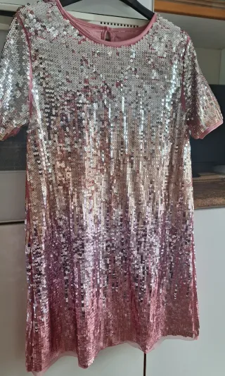 Vestito corto con paillettes per bambina, taglia 14 anni. Perfetto per occasioni speciali. - Paillettes iridescenti con sfumatura rosa. - Maniche corte. - Scollo rotondo.