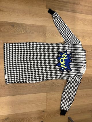 Vestito a maniche lunghe con fantasia pied de poule. - Stampa WOW sul davanti. - Collo alto. - Polsini neri a contrasto.