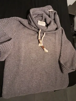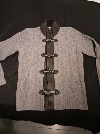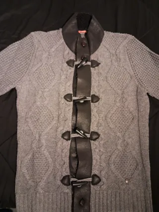 Elegante maglione con un design unico. - Tessuto a trecce. - Chiusura frontale con alamari in ecopelle. - Collo alto foderato.