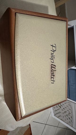 Vendo per i amanti del vintage elegante orologio da uomo Philip Watch Seahorse del 2003 originale e perfettamente funzionante, mai usato e completo di scatola originale. Il modello Seahorse è un classico della collezione Philip Watch, caratterizzato da design sportivo ma raffinato, Chronograph e chronometro multifunzione e quadrante chiaro con dettagli placcato oro giallo, ideali per uso quotidiano o elegante. Il cinturino bi colore. Le tasche, le lancette, la ghiera, i pulsanti, la corona e il cinturino sono placcati oro 18 Karat. Marca: Philip Watch Collezione: Seahorse Movimento: Quarzo Swiss Made Condizione: Nuovo, mai indossato