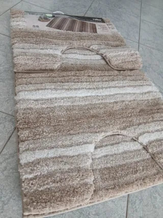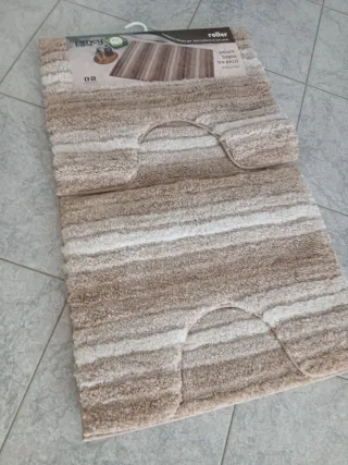 Set di tappeti per il bagno Fancy Home. - Design a righe in tonalità beige e marrone. - Materiale in tessuto morbido. - Include tre pezzi per coprire diverse aree del bagno.