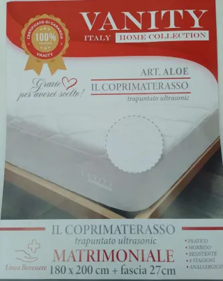 Coprimaterasso Vanity trapuntato ultrasonic, misura matrimoniale. - Art. Aloe - Pratico - Morbido - Resistente - 4 stagioni - Anallergico - Misure: 180 x 200 cm + fascia 27 cm NUOVO COPRIMATERASSO IN ALOE VERA TRAPUNTATO😍😍😍 MISURA 1POSTO 90X200-27CM🔝9.00€ 2POSTI 180X200+27 🔝🔝11.00€ SUPER PREZZO ANALLERGICO 😍😍😍