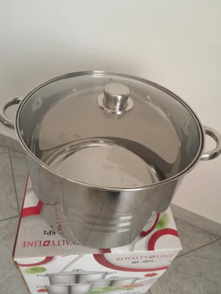 NUOVO SET 5 PEZZI PENTOLE - Acciaio inossidabile di alta qualità - Fondo termico: fondo a 3 strati con conduzione termica - Adatto a tutti i tipi di fotnello: o Induzione o Elettrico o Gas o Ceramica o Alogeno - La superficie durevole è resistente ai graffi e agli involucri - Il corpo in acciaio non reagisce con il cibo - Facile da pulire e lavabile in lavastoviglie Pentola con coperchio in vetro Ø 26 * 21 cm, 11.1L con piccolo graffietto come in foto Pentola senza coperchio 0 28 * 22 cm, 13.5L Pentola con coperchio in vetro Ø 30 * 23 cm, 16.2L OFFERTISSIMA INVECE DI 55.00€A SOLO 45.00€