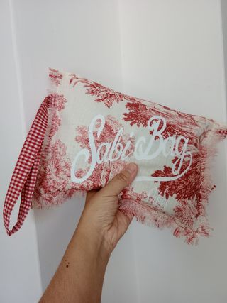 Borsetta a mano con polsiera in cotone fantasia toile de jouy rosso, frangia sfilata a mano. È un prodotto artigianale e nuovo, misura 20*30. per altre informazioni contattami ☺️