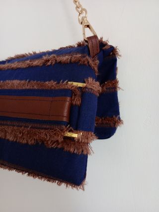 Borsetta in cotone blu con frange, maniglia per portarla a mano oppure tracolla oro. Si apre maggiormente e diventa più capiente