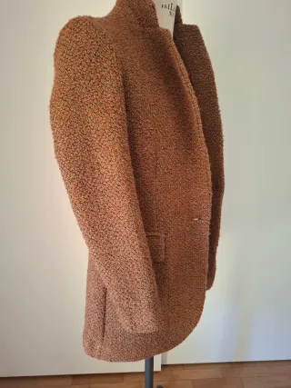 Elegante cappotto invernale con una texture particolare. - Tessuto bouclé - Colore principale marrone con sfumature arancio. - Collo a scialle. - Tasche applicate sul davanti.