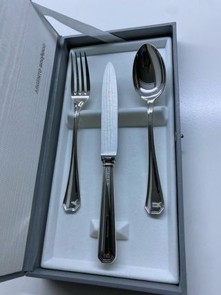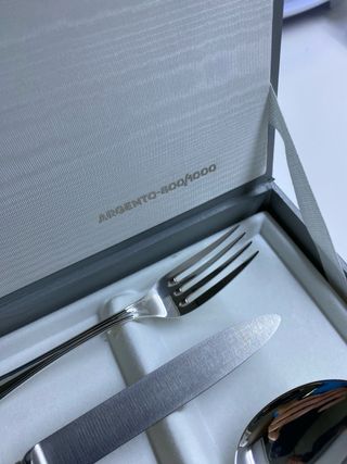 Elegante set di posate per bambini in Argento 800. COMPOSTA DAI SEGUENTI PEZZI: n.1 cucchiaio in argento n.1 forchetta in argento n.1 coltello in argento (CON ESTREMITA' IN ACCIAIO INOX). Completo di custodia. Mai usato. Peso delle tre posate 97 gr. Lunghezza coltello 18 - forchetta peso 23 gr e cucchiaio 15 cm peso 28 cm Categoria Set di posate - Posate finemente lavorate. - Design classico e raffinato. - Ideale come regalo speciale.
