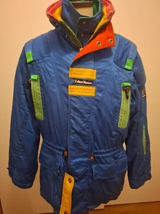 Giacca da sci Anzi Besson vintage con un design vivace e colorato, perfetta per un look retrò. - Colori vivaci: blu, giallo, arancione, rosso e verde. - Tessuto a coste sul blu. - Dettagli con zip e bottoni.
