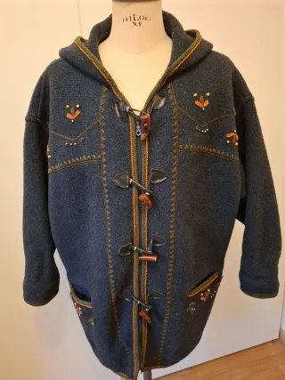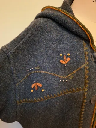 Giacca in stile tirolese con dettagli ricamati e chiusura a zip e alamari. - Motivi floreali applicati. - Bordi decorati con cuciture. - Cappuccio integrato. - Tasche frontali. - Fodera interna.