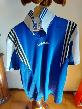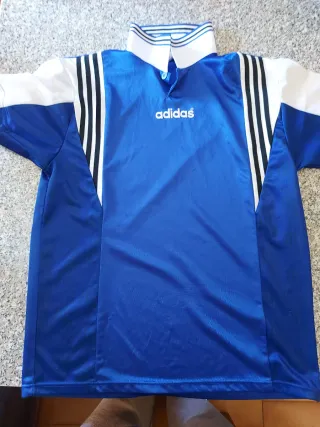 Maglietta sportiva Adidas con un design accattivante. - Colletto bianco con righe blu e nere. - Maniche bianche con le classiche tre strisce nere Adidas. - Logo Adidas ricamato sul petto.