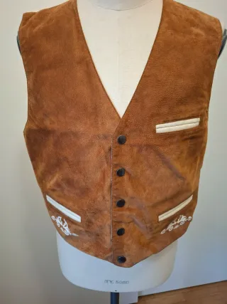 Gilet in pelle scamosciata marrone, taglia L, realizzato a mano con cura. - Dettagli in pelle chiara sulle tasche. - Ricami bianchi decorativi sulle tasche inferiori. - Chiusura con bottoni. - Design tipico tirolese.
