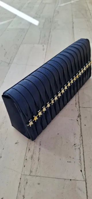 Elegante pochette blu, perfetta per occasioni speciali. - Tessuto blu con pieghe decorative. - Fascia centrale con applicazioni dorate e strass. - Dimensione 24x10x4 - usata in 2 occasioni
