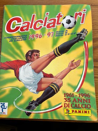 Album Panini Calciatori edizione 1996-1997. Album completo - Copertina con illustrazione di un calciatore in azione. - Celebra i 35 anni di calcio Panini (1961-1996). - Include le serie A, B e C1-C2.