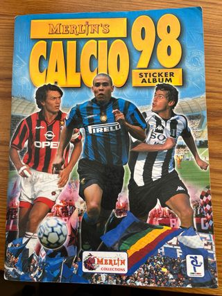 Album di figurine Calcio 98 di Merlin Collections. album completo - Copertina con i calciatori Ronaldo, Maldini e Del Piero. - Edizione 1998.