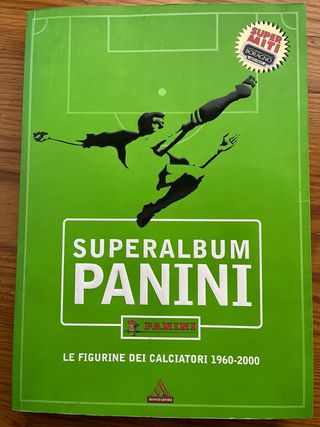 Superalbum Panini che raccoglie le figurine dei calciatori dal 1960 al 2000. - Copertina verde con grafica di un calciatore. - Titolo SUPERALBUM PANINI in rilievo. - Sottotitolo LE FIGURINE DEI CALCIATORI 1960-2000. - Logo Mondadori in basso.