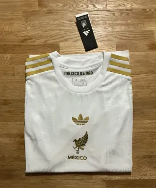 Maglia Adidas Mexico de Oro taglia M. Un capo sportivo con un design elegante. - Colore bianco con dettagli dorati. - Tre strisce dorate sulle spalle. - Logo Adidas dorato sul petto. - Stemma del Messico dorato sul petto.