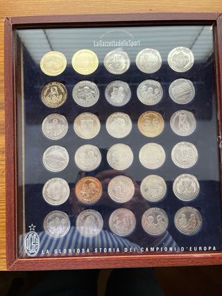 Bellissima collezione di monete La gloriosa storia dei Campioni d'Europa. - Monete commemorative in cofanetto. - Design dettagliato su ogni moneta. - Cofanetto in legno con finiture in vetro.