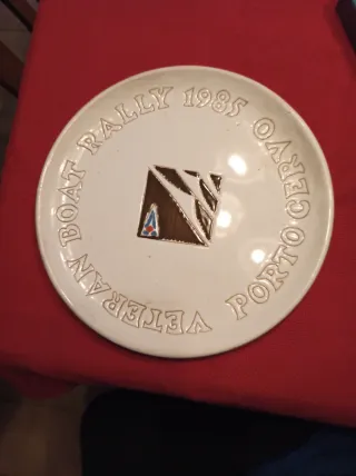 Piatto in ceramica con decorazioni a rilievo della veteran boat rally - Veteran Boat Rally 1985 -porto cervo - Logo centrale con elementi triangolari marroni e un piccolo dettaglio blu e rosso.