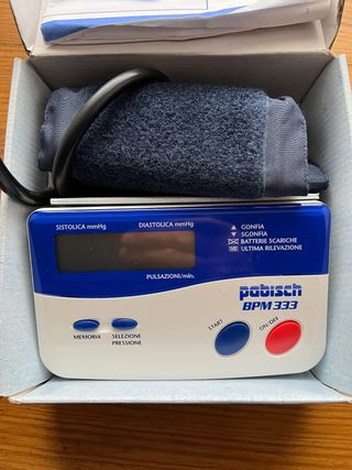 Misuratore di pressione sanguigna Pabisch BPM 333. - Bracciale in tessuto blu. - Display digitale. - Pulsanti per memoria, selezione pressione, avvio e spegnimento. - Indicatore batterie scariche.